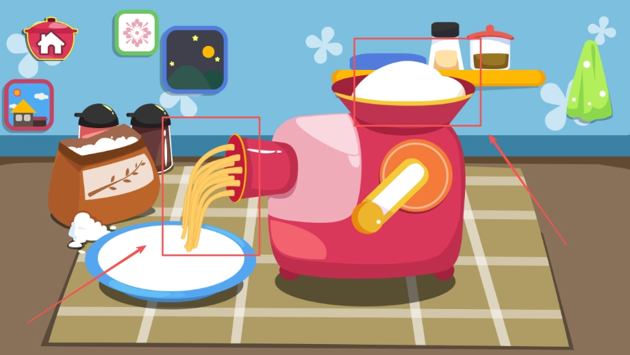 1、场景设计贴合真实厨房的环境布局,各类用具与食材的造型可爱又生动,能充分调动孩子的探索兴趣与好奇心,助力他们观察能力的培养。