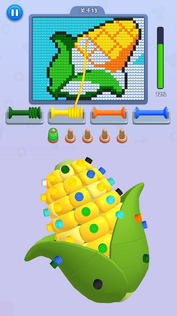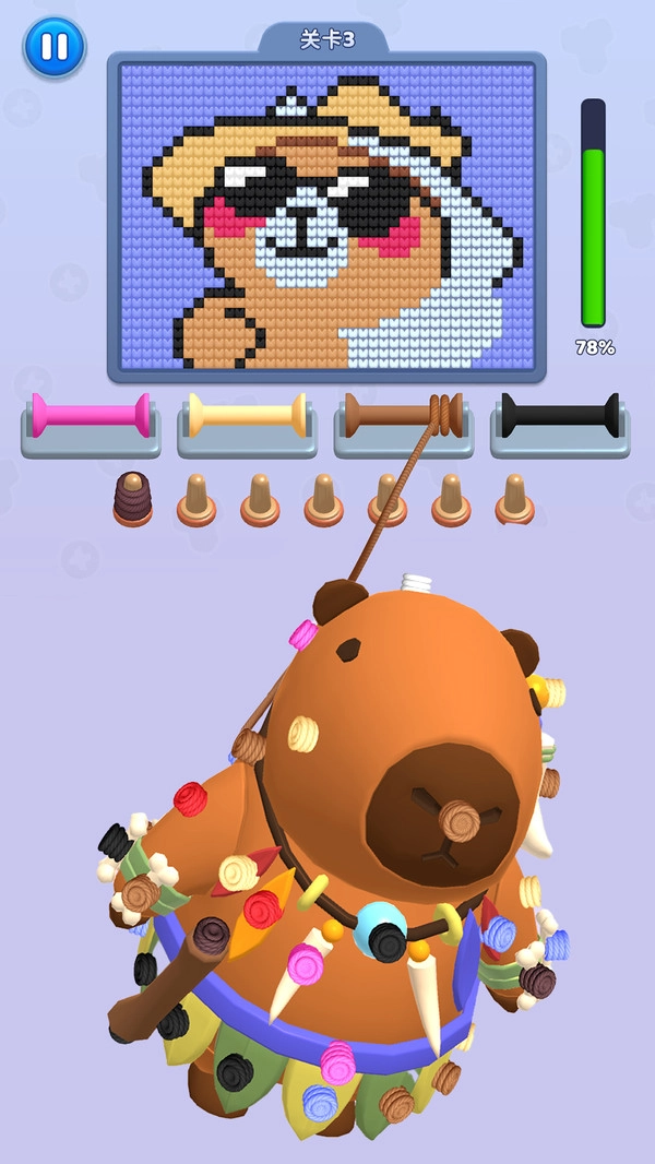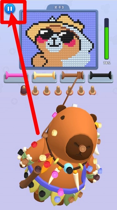 2.左上角设有暂停按钮,需依据毛线颜色的不同提示,按顺序填充对应的色块,逐步完善细节,最终完成戴墨镜小熊角色的像素图像。