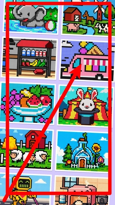 1.画面呈现多幅像素拼图作品,玩家能够自主挑选心仪的图案开启挑战,每款拼图都具备独特的主题以及多样的色彩组合。