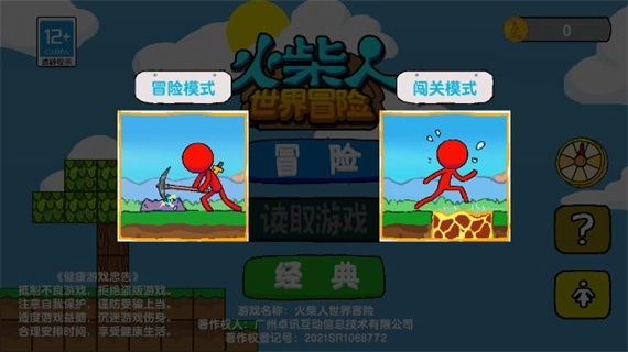 1、双击打开火柴人世界冒险,玩家可选择点击冒险模式或闯关模式开始游玩,接下来为大家介绍的是冒险模式。