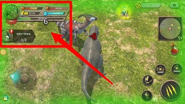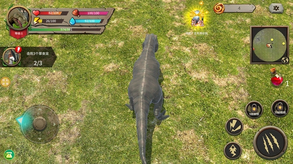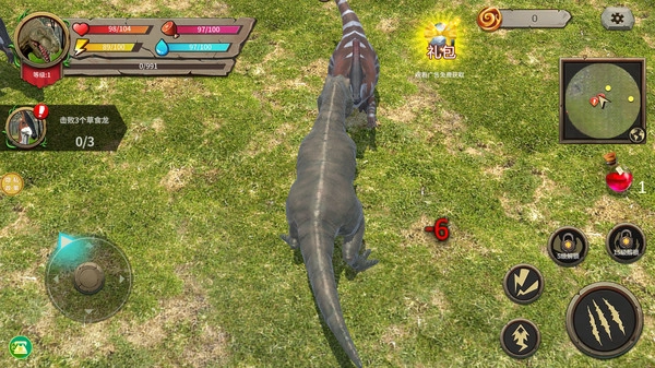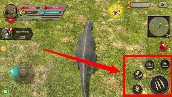 1.左侧虚拟摇杆:拖动屏幕左下角的虚拟摇杆,即可操控暴龙移动,自由探索草地并寻找猎物的踪迹。
