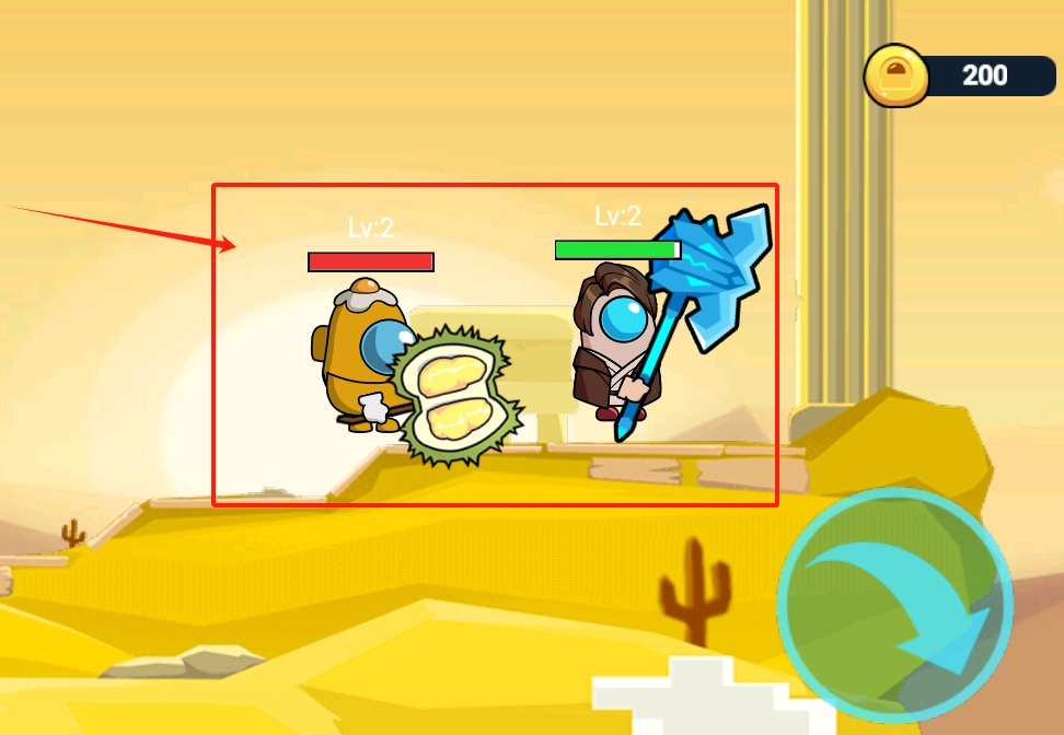 3、场景里,等级为Lv:2的两个角色正处于对峙状态,左边的角色被榴莲砸到了。