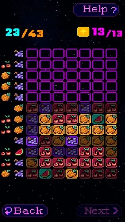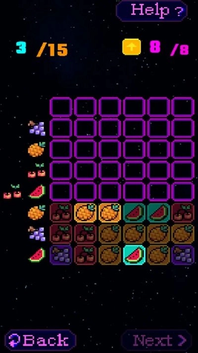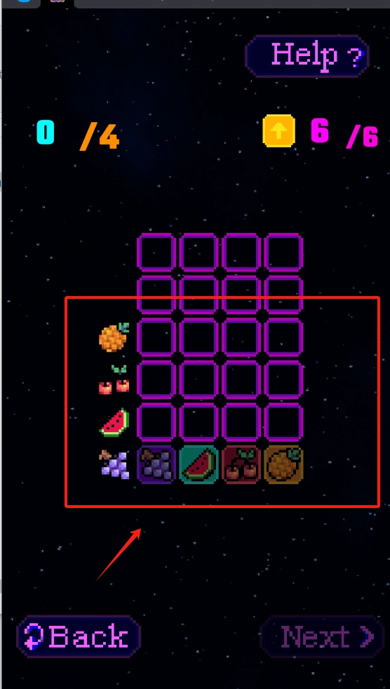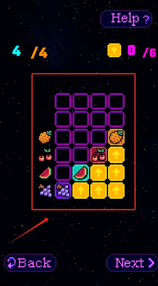 3、点击黄色箭头按钮来操作水果,按Next键进入下一关,Back键则可退回上一步进行调整。