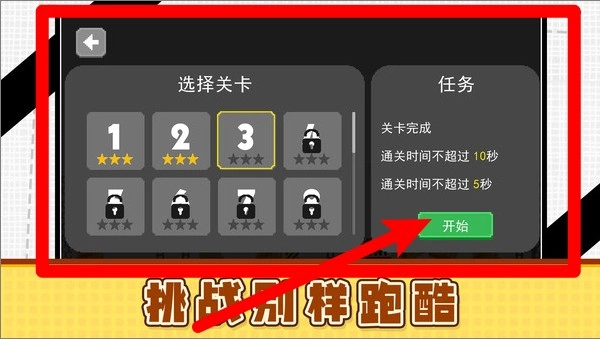 1.关卡选择:关卡界面设有丰富多样的挑战任务,玩家能够依据完成条件解锁更高星级,点击开始按钮即可开启全新的冒险征程。
