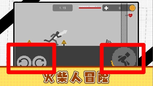 2.操作按钮:屏幕下方设有前进与跳跃按钮,玩家需要灵活运用这两个按钮来操控火柴人角色,完成跑酷以及躲避障碍的动作。