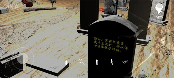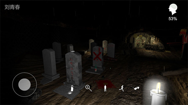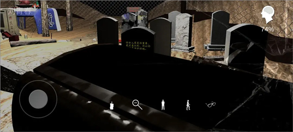站在那些刻有名字的墓碑后方,戴上墨镜,熄灭蜡烛,静静等待闪电。每当闪电划过一次,墓碑上就会显现出不同的铭文,你要赶紧去点击这些铭文,相关的线索便会自动被收集起来。