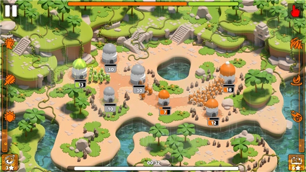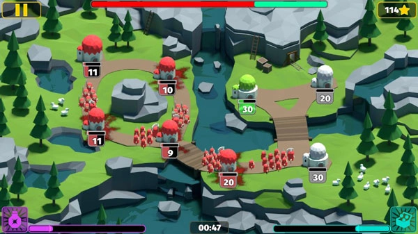 玩法:整体而言,这款游戏相当容易上手,只需选择城堡并选定进攻目标就行,过程中可以同时选择多个目标,士兵会源源不断地从城堡出发,一直抵达指定位置;另外,左下方的能量还能用来给士兵加速,或是提升他们的攻击与防御能力。