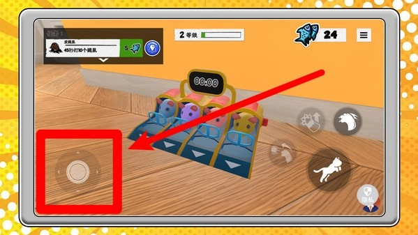1.画面呈现出趣味小装置,玩家借助左下角的摇杆实施移动操作,搭配右侧按钮操控猫咪的行动以完成挑战。