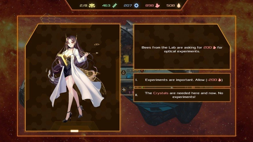 2、你是“Melistar”(“星际蜜蜂”)的指挥官,麾下统领着一群具备智能的拟人化蜜蜂。飞船是你的移动家园,你的职责包括:提升飞船的战斗能力,以此击退敌人的进攻;维持既定航向,高效采集各类资源,保障蜂王与士兵都能获得充足的食物供给;同时,也得留意船员们的状态,他们时常会遇到麻烦,甚至自己制造出一些麻烦。