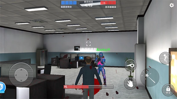 6、游戏开始后,界面顶部显示倒计时,底部显示自身血量,若被寻找者攻击则会死亡; 7、只要成功隐藏自己不被找到,就能获得胜利!