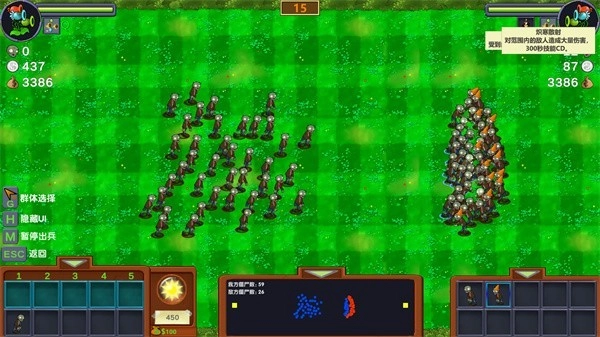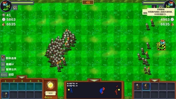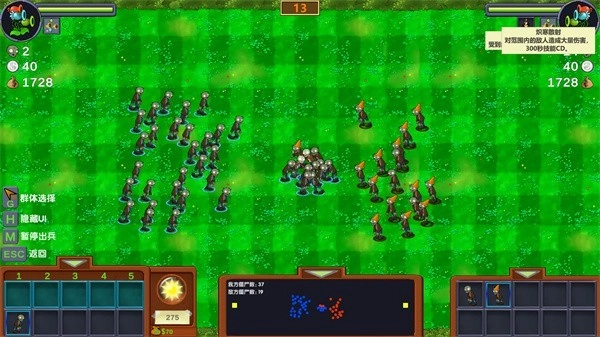 3、开始后,顶部倒计时结束时,系统会自动给敌我双方分配资源(包括人数和资金)。你可以依据我方当前的资源,挑选合适的僵尸出击;也能暂停或恢复我方僵尸的出动。每派出一只僵尸,都会从当前资金(带有硬币标记的那栏)里扣除该僵尸所需的费用。当当前资金不足,或者可出动的僵尸人头数为0时,就无法再派出僵尸了。不同关卡的资源都设有上限,具体上限因关卡而异。