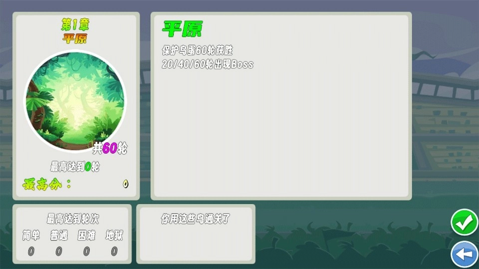 2、若选择从第一章开始,界面会展示该章节的相关信息,例如需要保护鸟蛋达到60轮才能获胜,并且在第20轮、第40轮和第60轮时会有boss出现。