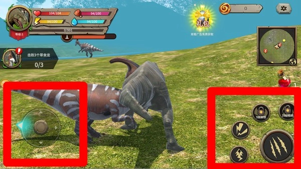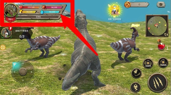 2.界面信息:屏幕左上角会呈现恐龙的血量、体力以及水分数值,玩家需要时刻留意这些数值,以保证恐龙能在荒野环境里维持稳定的生存状态。