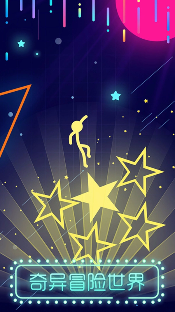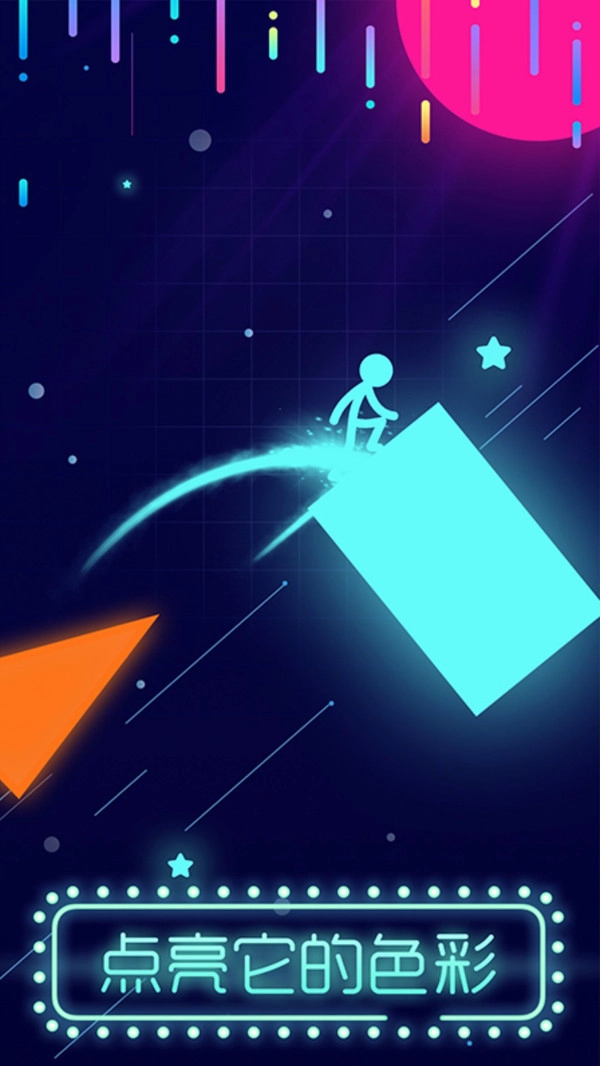 1、玩法趣味十足,关卡数量丰富。在游戏里,你要帮助火柴人顺利跳到霓虹方块上,让它的颜色被点亮。