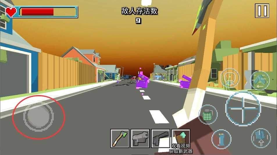 2、右侧的按键分别用于跳跃闪避和发动攻击,点击中央的武器轮盘能够快速切换不同的枪械类型。