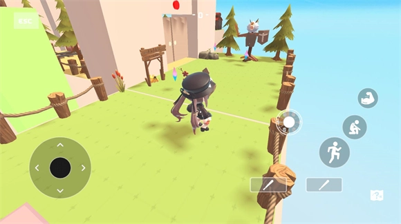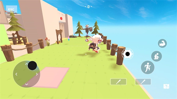 4、进入地图后,左侧轮盘用于操控角色移动,右侧轮盘负责控制表情,其余按钮则分别对应攻击键、跳跃键和蹲下键。