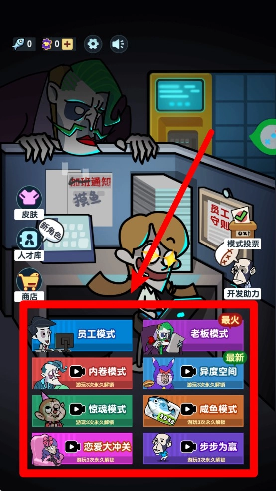 1.职场反讽主题:围绕“上班摸鱼”展开,剧情设计贴合现实场景,玩家能体验到与老板周旋对抗的爽快感,释放日常工作压力,极易引发共鸣。