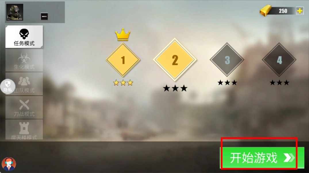 1、进入任务选择模式,可看到关卡1、关卡2等选项,点击右下角绿色的开始按钮,就能进入对应关卡的战斗场景。
