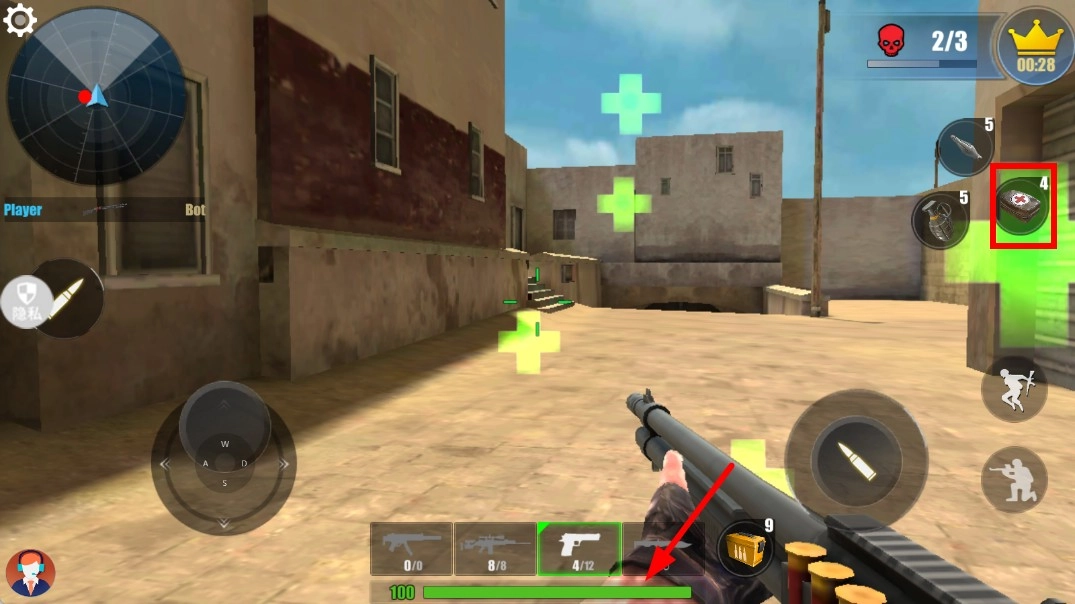 4、当角色生命值下降时,点击右侧的医疗包图标,就能恢复角色的生命值,使角色可以继续在场景中与敌人战斗,进而达成关卡目标。