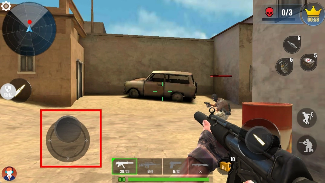 2、战斗场景中,你可以借助左侧的虚拟摇杆,操控角色在包含车辆与建筑的区域内移动,以此搜寻敌人的位置,为发起攻击做好准备。