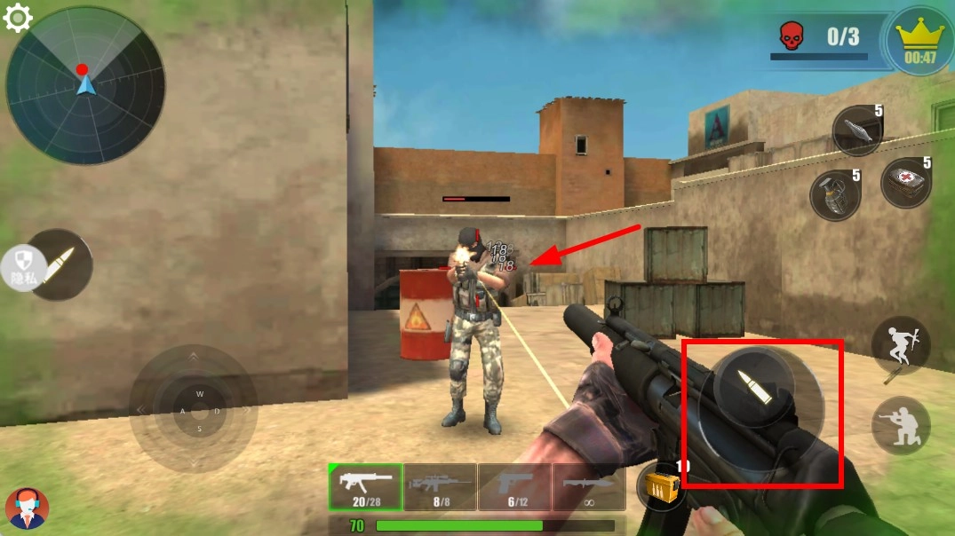 3、发现敌人后,瞄准目标并点击右侧的攻击按钮,角色就会用枪械射击敌人,同时要注意自己的弹药剩余量,以保证能持续战斗。