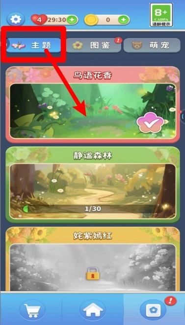 1.点击左上角的“主题”选项进入背景页面,就能自由切换各类主题场景,解锁后还可以更换成自己喜欢的花卉风格。