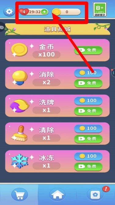 2.画面顶部展示着当前的体力值和金币数量,体力会每隔一段时间自动补充,金币则能通过通关关卡或者观看广告来获取并使用。