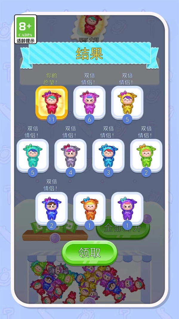 3.玩家可点击“全部打开”按钮,快速开启多个盲袋以收集果冻人角色,丰富个人收藏,增添游戏乐趣。