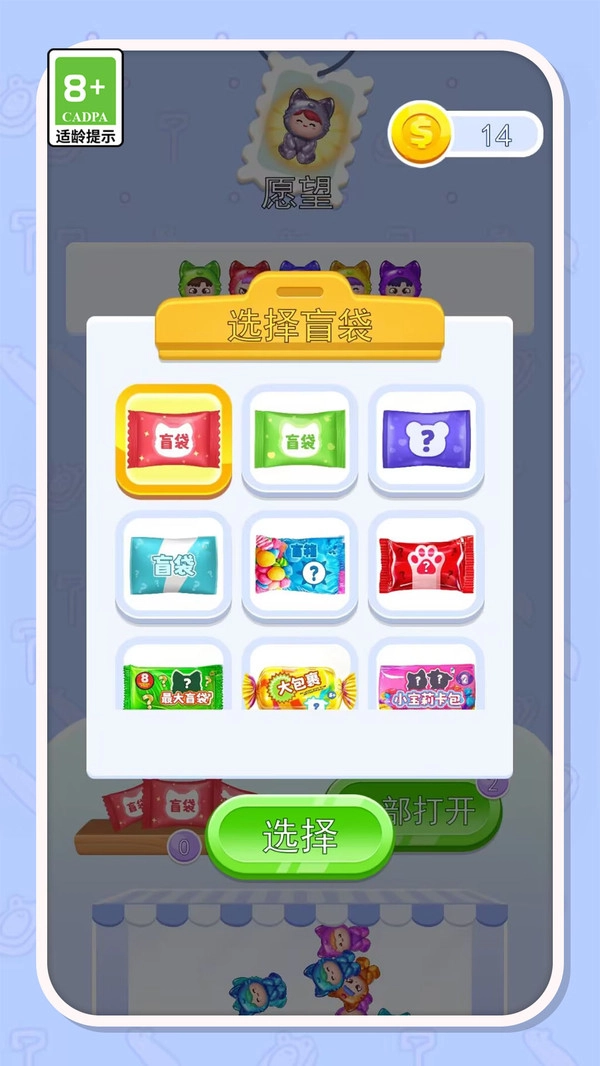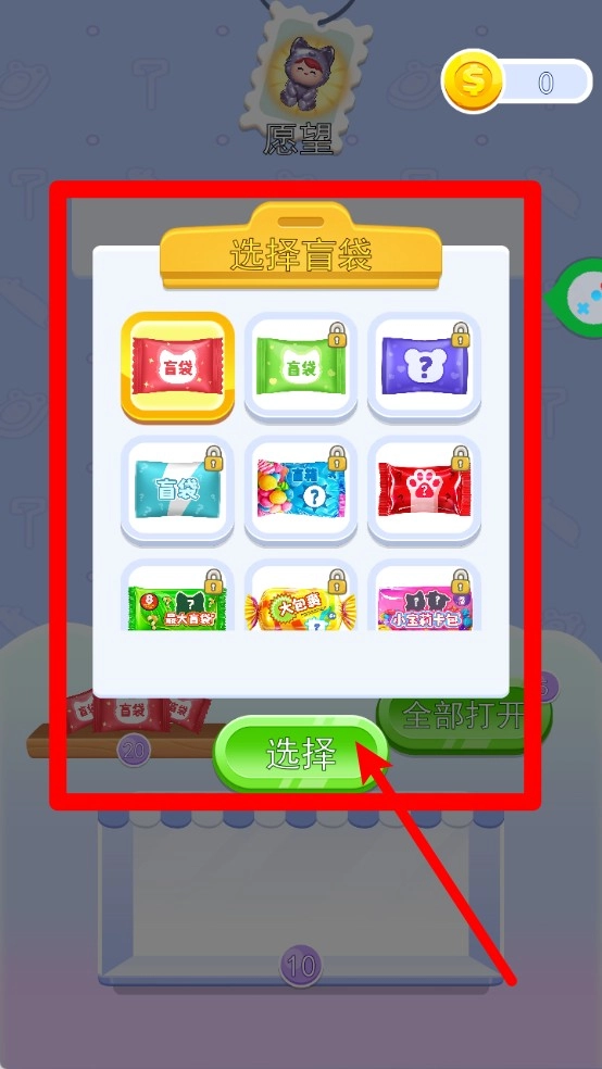 2.在挑选盲袋的过程中,玩家能够选择开启不同的袋子,每个盲袋里都装有不一样的果冻角色,点击“选择”按钮就能查看并开启。
