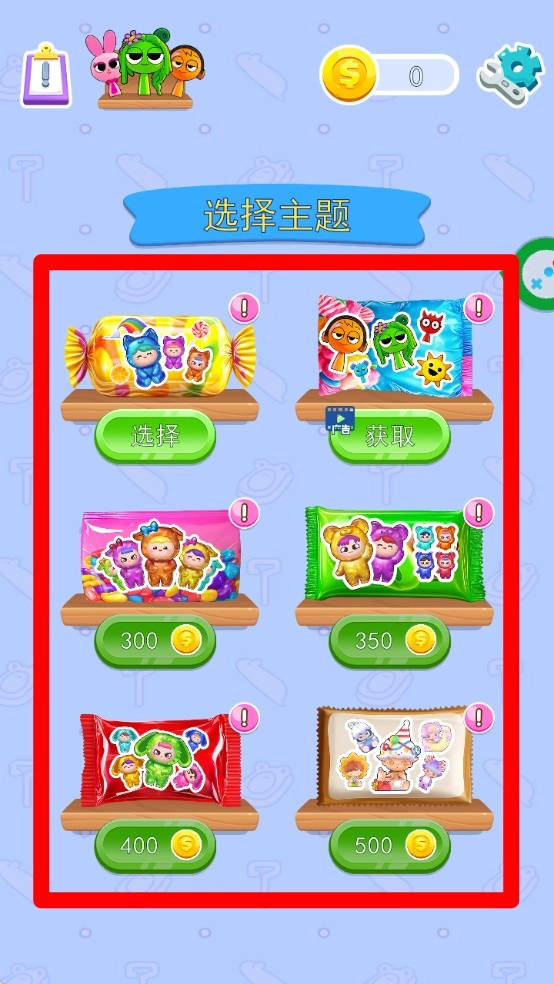 1.玩家可挑选不同的果冻主题包,点击“选择”按钮即可解锁每个主题包,每个主题包中都有不同的果冻角色。