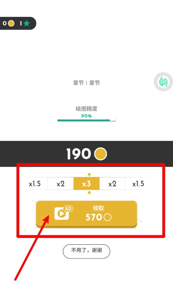3.观看广告能让奖励翻倍,点击“领取570”按钮可使当前金币数量乘以3,从而快速提高资源获取效率。