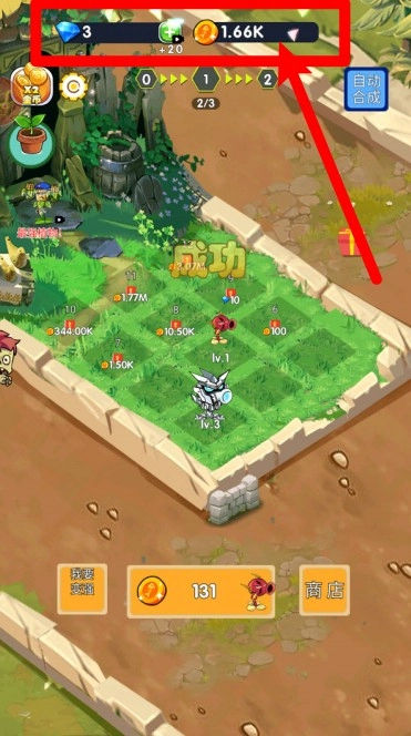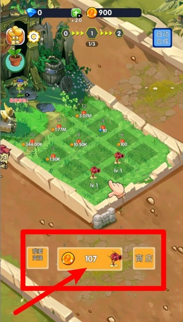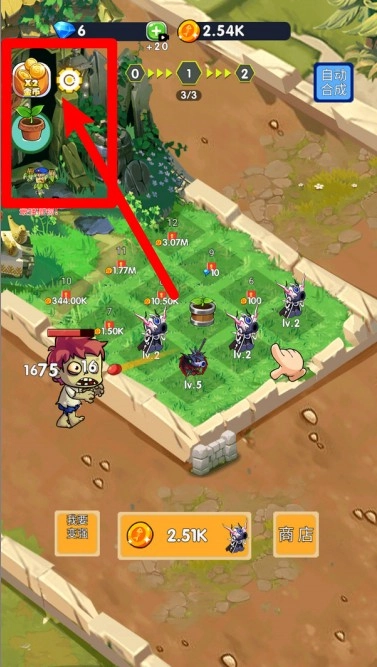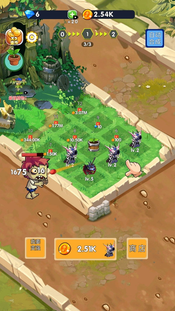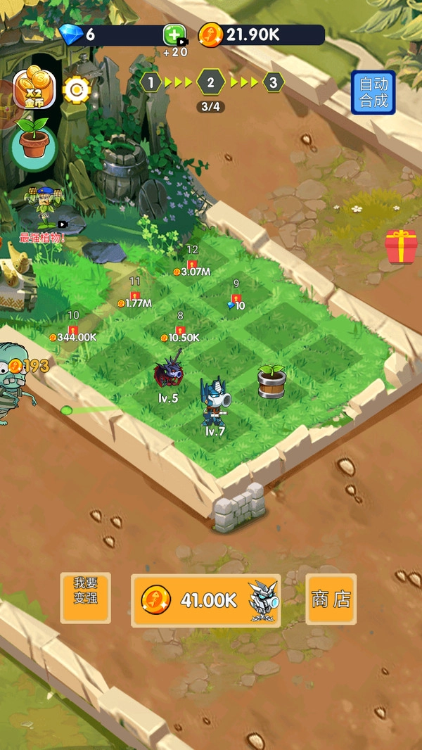 3.点击底部的购买按钮,就能马上用金币兑换新植物。持续合成升级植物,提升它们的等级,从而构建更坚固的草坪防御体系。
