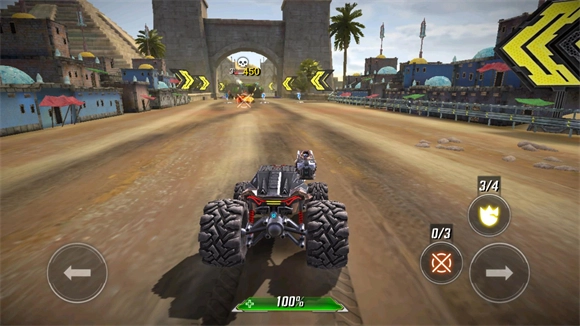 7、进入关卡后,左右两侧的箭筒用于控制车辆转向,蓝色按钮对应冲刺功能,紫色按钮为终极技能,红色瞄准图标可发射导弹,黄色盾牌则是护盾,所有按钮点击即可触发使用。