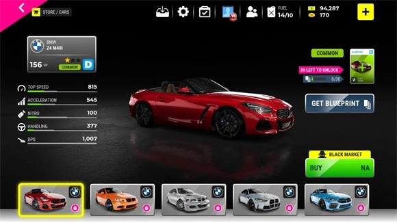 3、你可以点击左侧的ABCDE来选择不同等级的车辆,然后选择想要购买的车辆进行解锁。