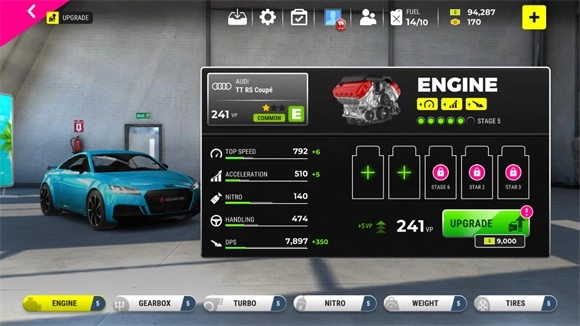 4、能够对车辆的引擎、操控、涡轮、喷气、速度、轮胎等部件进行升级,而升级操作需要消耗金币。