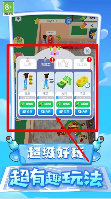 2.角色升级机制:玩家能够进入角色界面,对自身、清洁工、顾客以及垃圾桶进行等级提升,以此增强移动速度、经营收益和清洁效能,使餐厅的整体运营更为顺畅。