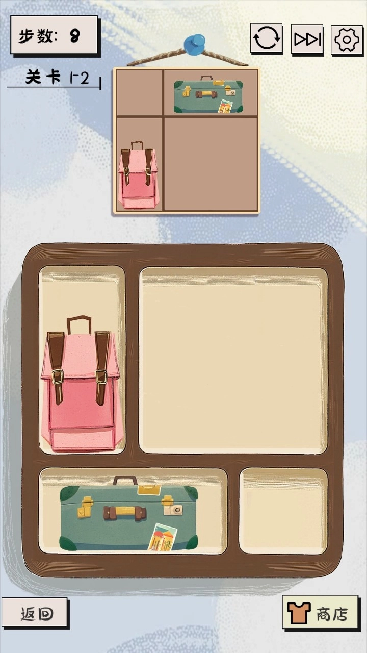 移动方块拼图:关卡里的物品都在能移动的方块格子中,玩家可以自由滑动这些方块,借助循环的机制来巧妙调整物品的摆放位置。从右边移出的方块会从左边重新出现,玩家需要合理规划移动的路线,一步步让物品回到正确的位置上。
