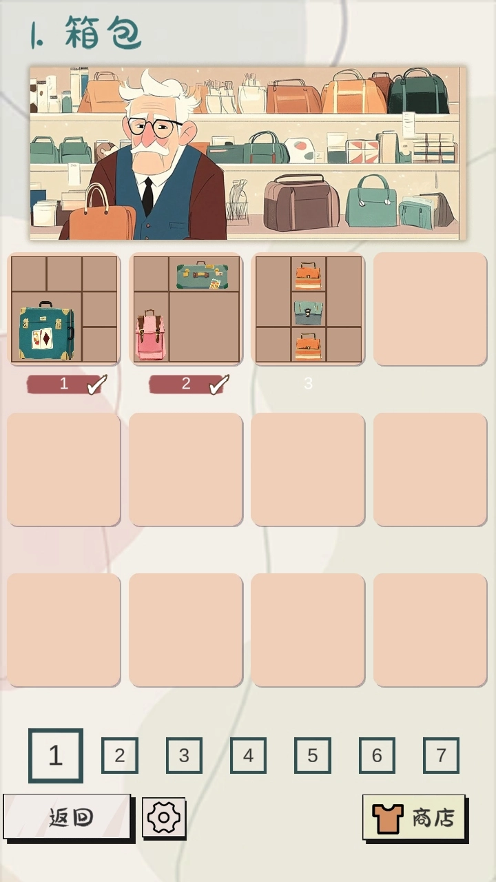 每一关开始时,界面会展示目标图案,玩家需要把杂乱的杂货铺布局整理成和目标图案完全一致的样子。例如,目标可能是让水果摆成特定的造型,或者将衣帽排列得整整齐齐。