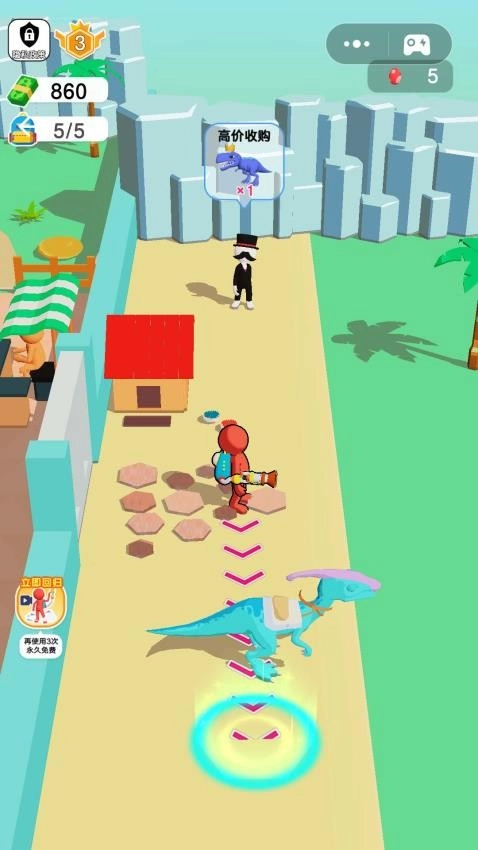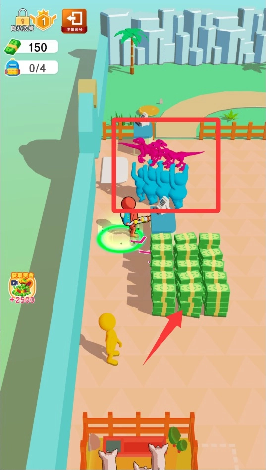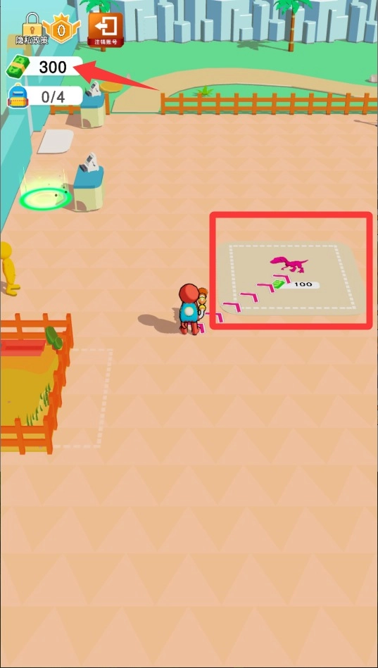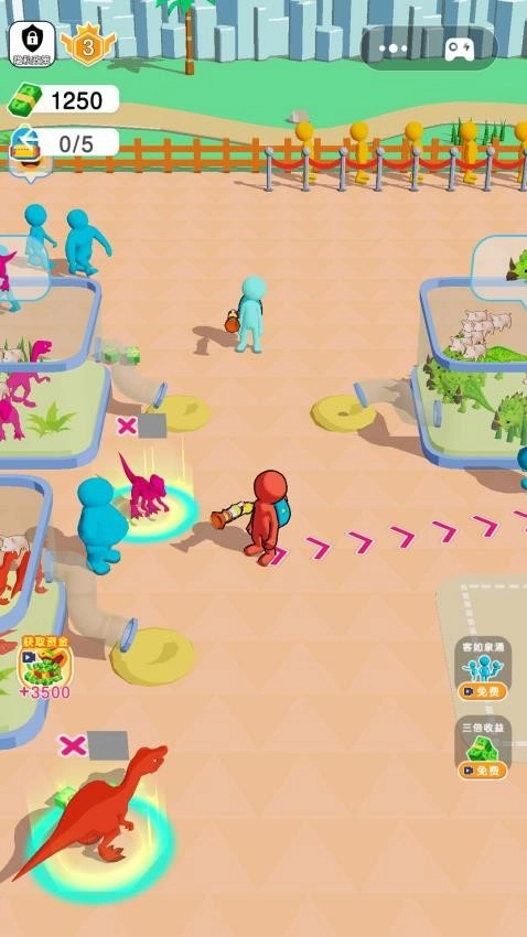 4、把已经驯化好的恐龙拖到交易区域进行售卖,依据恐龙的体型大小和品种类型来获取金币,每天第一位前来购买的客人会给出双倍的价格进行收购。