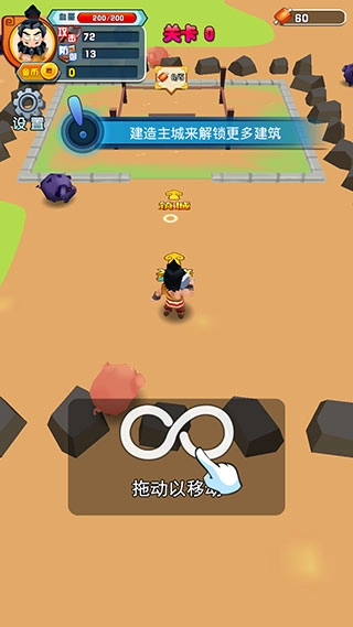 1、首先我们进入游戏,通过拖动屏幕就能控制张飞移动,现在要完成第一个任务——建造主城。