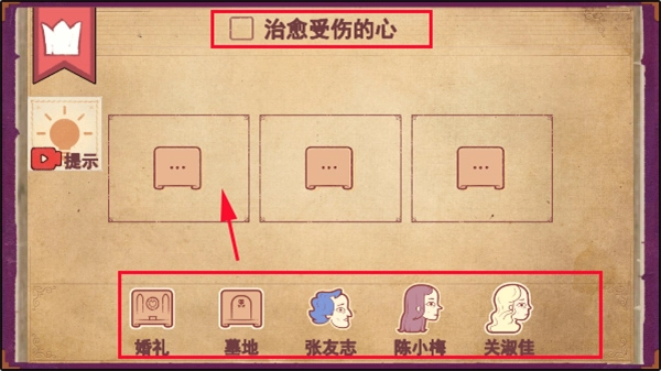 3、要是关卡难度偏高,大家可以点击左侧的提示来获取一项标准答案,只要我们还原答案对应的剧情就能顺利通关,具体操作可参考下图;