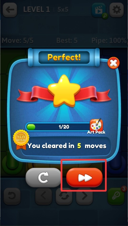 4、当确认本关任务已经完成后,点击右下角的箭头,就能解锁后续难度更高的水管拼接挑战,从而逐步提升操作技巧。