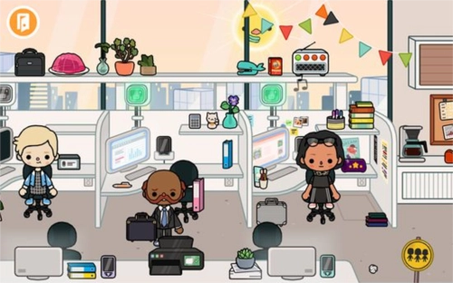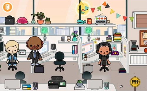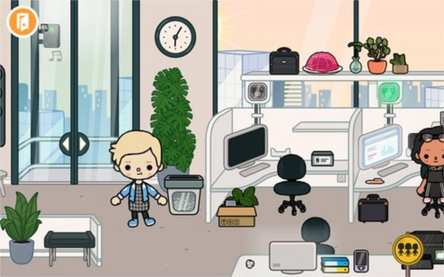 2、我们任意点击一栋大楼就能进入内部,比如选择商业楼宇,进入后会看到里面是一间办公室,能看到不少办公用品,还有许多正在工作的人员。