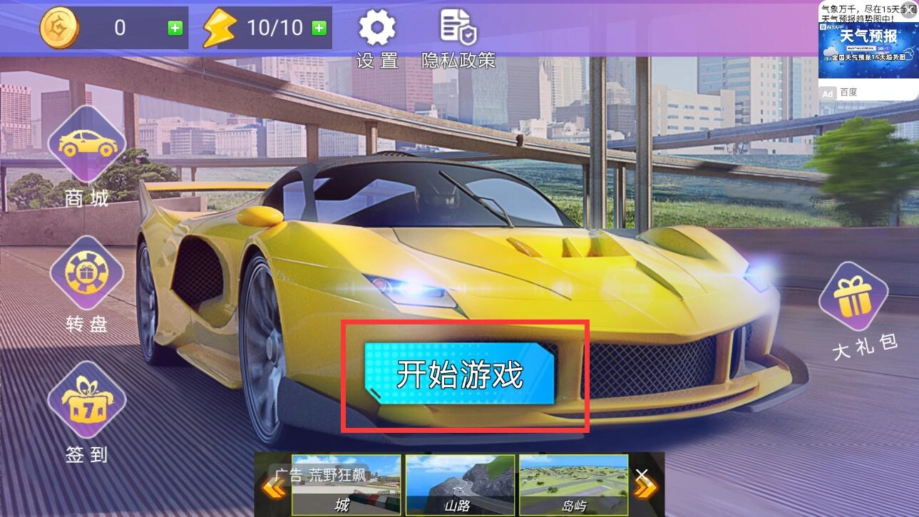 2、在主界面中央找到醒目的开始按钮,点击后就能进入关卡选择页面啦。不同的赛道对应着独特的地形和难度,新手朋友建议从初级赛道开始练习。