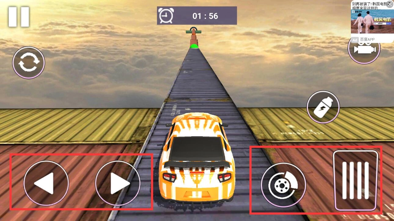 4、右侧的虚拟按键分别对应刹车和油门功能,漂移操作时需要结合方向键进行快速切换。长按油门键能够实现加速,适时轻点刹车键有助于维持平衡,顺利通过连续弯道还能获得额外加分。
