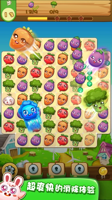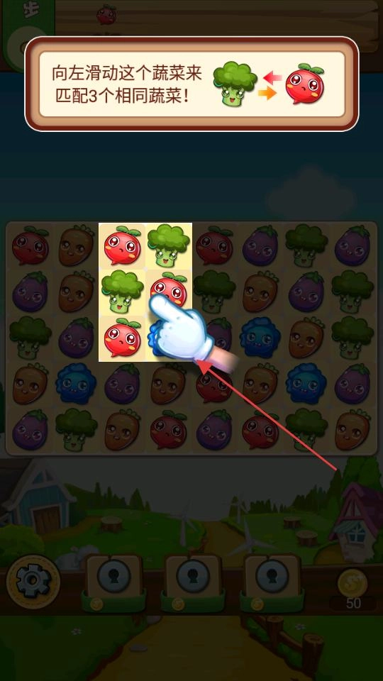 3、进入关卡后,按照提示找到指定蔬菜,向左滑动该蔬菜,让它和相邻的相同蔬菜配对,只要凑够3个相同的蔬菜就能消除,依照这个规则完成关卡里的消除任务。
