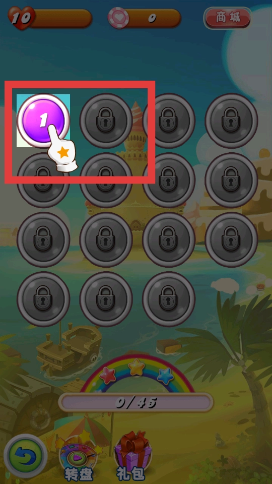 1、在关卡选择界面,点击未锁定的关卡按钮,就能进入对应的关卡,界面上方会显示当前拥有的步数道具数量和爱心数量。