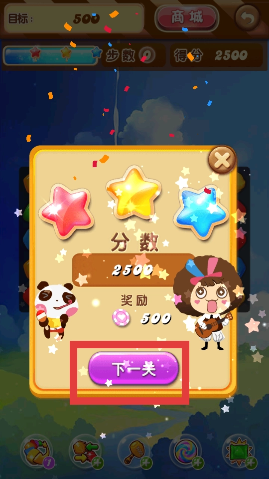 3、在规定步数内成功达成目标分数后,系统会依据消除表现给予对应的分数与奖励,领取奖励后,点击下一关按钮即可。