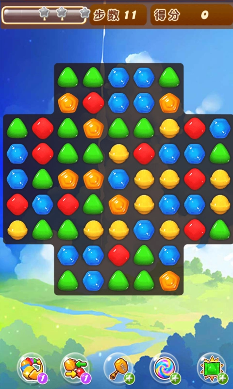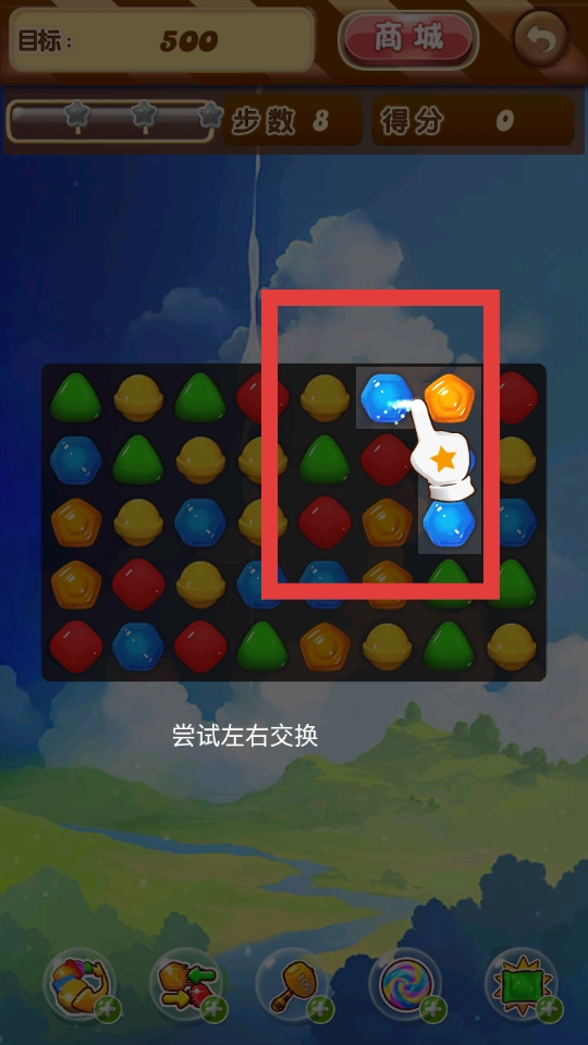 2、进入关卡后,通过点击来交换相邻糖果的位置,只要让三个或三个以上相同颜色的糖果连成一条线,就能完成消除。