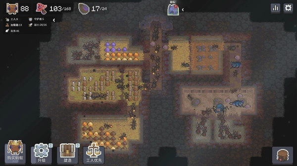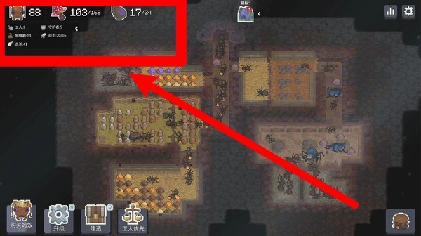 2.界面左上角展示着资源存量与单位数量的信息,涵盖食物、虫卵、蚁兵等数据,这些是蚁巢发展过程中的关键参考依据。
